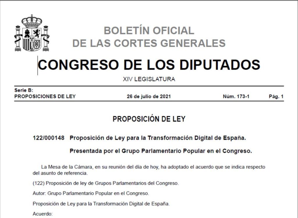 El pasado 26 de julio, la Mesa del Congreso de los Diputados admitió a trámite trasladar al Gobierno la Proposición de Ley para la Transformación Digital de España presentada por el Grupo Parlamentario Popular.