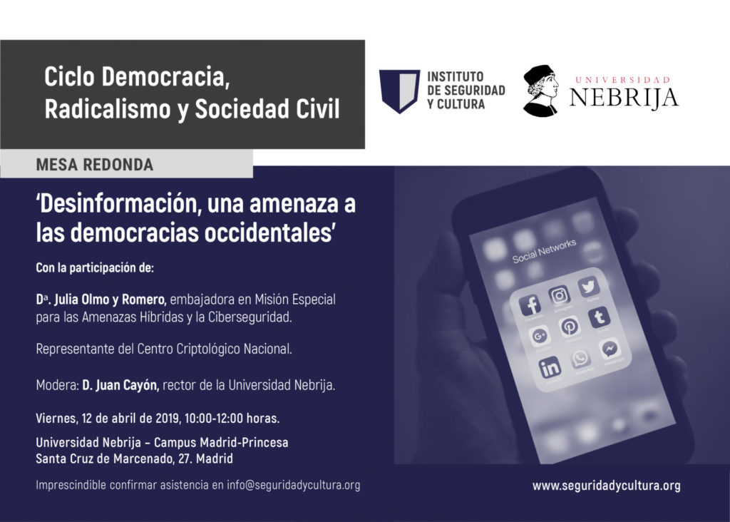 El Instituto de Seguridad y Cultura y la Universidad Nebrija organizan la mesa redonda ‘Desinformación, una amenaza a las democracias occidentales’ que tendrá lugar el próximo viernes 12 de abril de 10:00 a 12:00 horas en Madrid en la Universidad Nebrija Campus Madrid-Princesa, situado en la calle de Santa Cruz de Marcenado, 27.